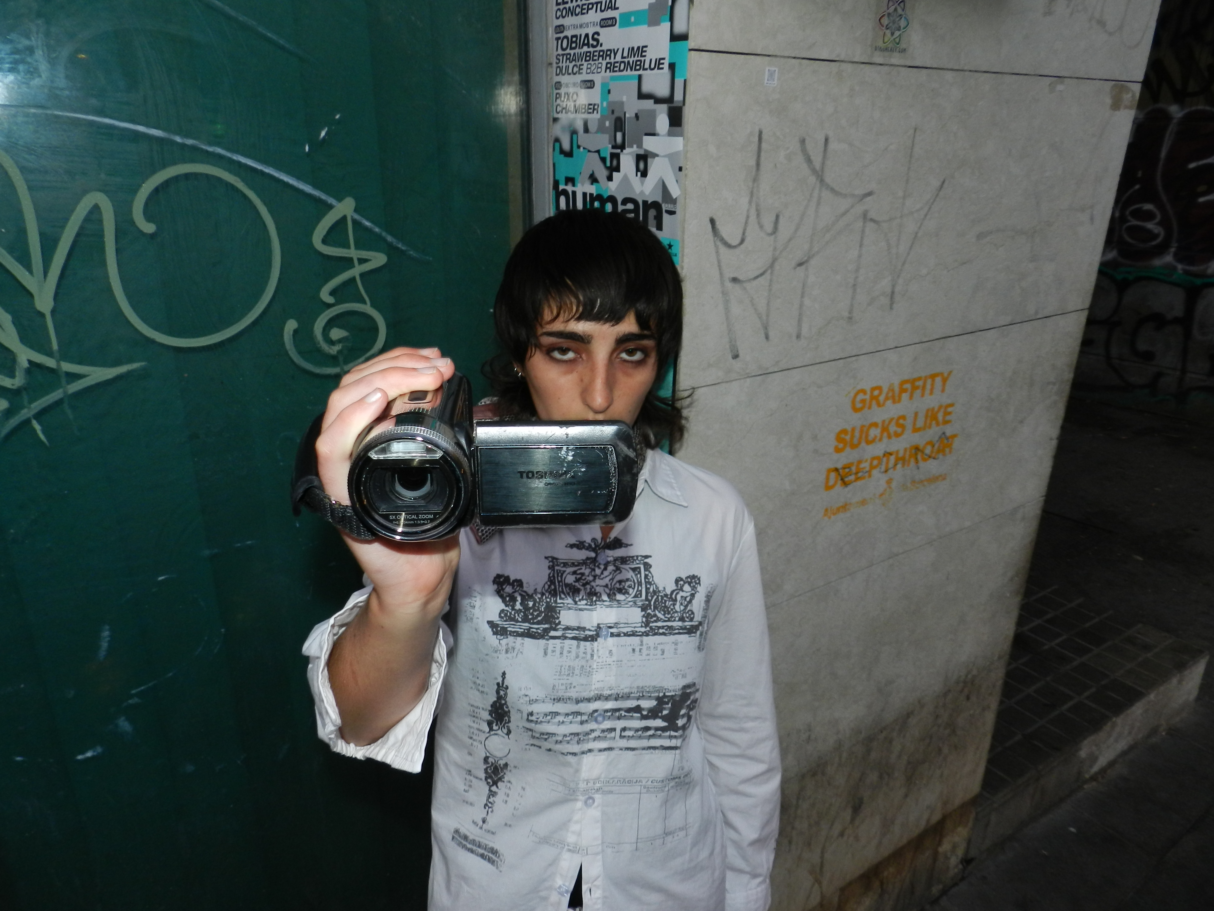 A woman navigates Barcelona's streets wearing Latvian and West Europe symbols as living archive: intricate motifs on white cotton become defiant proof that history refuses to stay buried.